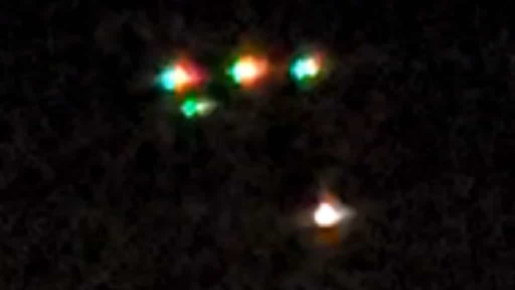 Not UFO’s… Helicopters on night ops. You can tell by the green lights marking right side, and can even see the silhouette for a moment in the light. How could you miss the rotor sound? RoFL. Just military choppers flying in formation.