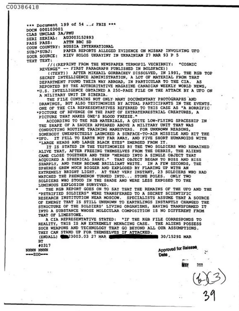 The CIA document in question is a translation of a 1993 article from the Canadian tabloid Weekly World News and the Ukrainian newspaper Holos Ukrayiny. The Weekly World News is known for publishing sensational and fictional stories. The CIA often collected such materials for analysis of foreign media and propaganda, not as verified intelligence. Therefore, the account’s credibility is highly questionable, and there is no corroborating evidence to support the claims made in the article.