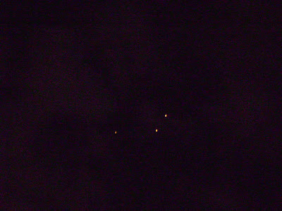 Witness report: My family and I were returning from a party last night, and my husband said look at the helicopters that are coming. As the first 3 lights got closer I said stop those are not helcopters, so he stopped and we took pictures and a short film with the camera. But behind those three lights were other three, and at the end 1 last. As the objects were over us there was no noise and they just started turning northeast and all of a sudden they moved fast upward and disappeared into the sky, there were low clouds, and the objects were flying under the clouds, you could see the orange-redish lights or round objects clearly.What ever it was has my teens and ourselves very puzzled. If anybody has an explanation for this please feel free to contact us.Author: Flor P.source: submitted to www.Latest-UFO-Sightings.net