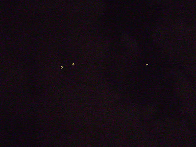 Witness report: My family and I were returning from a party last night, and my husband said look at the helicopters that are coming. As the first 3 lights got closer I said stop those are not helcopters, so he stopped and we took pictures and a short film with the camera. But behind those three lights were other three, and at the end 1 last. As the objects were over us there was no noise and they just started turning northeast and all of a sudden they moved fast upward and disappeared into the sky, there were low clouds, and the objects were flying under the clouds, you could see the orange-redish lights or round objects clearly.What ever it was has my teens and ourselves very puzzled. If anybody has an explanation for this please feel free to contact us.Author: Flor P.source: submitted to www.Latest-UFO-Sightings.net