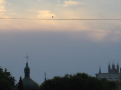 Hi my name is Shane, my son Jacob and i were going on a bike ride by the river to go fishing. So, we brought the camera in case we caught a fish or something else that was cool. After finding a turtle and taking pictures of it, we noticed it was getting late around 9:00pm so, we decided to leave. Biking back on the path heading West i happened to turn my head to the North and saw this very distinct dark object in the sky which appeared over the church in the far distance (the higest peak in the city) approx 1-2 km away from us above the church but, it seemed further away than that and a few hundred feet high possibly a thousand. At first i thought it was a hot air balloon but, i’ve seen those before and i knew it wasn’t that so, We watched it to see if it was moving but it didn’t go up or down or side ways it appeared to be slightly pulsating in one spot,in arms length it would be the size of a larger asprine but smaller than a dime.after watching it for a few minutes i remembered i had my camera so i took two pictures zoomed in at 14 times but it still wasn’t close enough to see good with the camera. I told my son we need to get closer to it to get a better picture! he didn’t want to but, we decided to go to the fire hall to get closer apprx 1-1 1/2 minute bike ride when we got there it was gone, nothing in the sky at all. My reaction was “what the!!” where did it go? I have seen this type of object before except a lot larger and in a different city but, this time i had a picture! to show what we saw.Author (source: mufon)