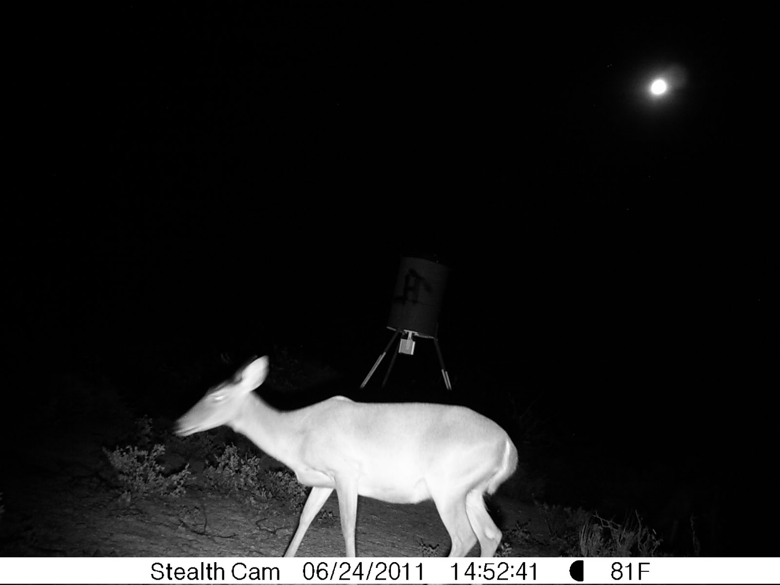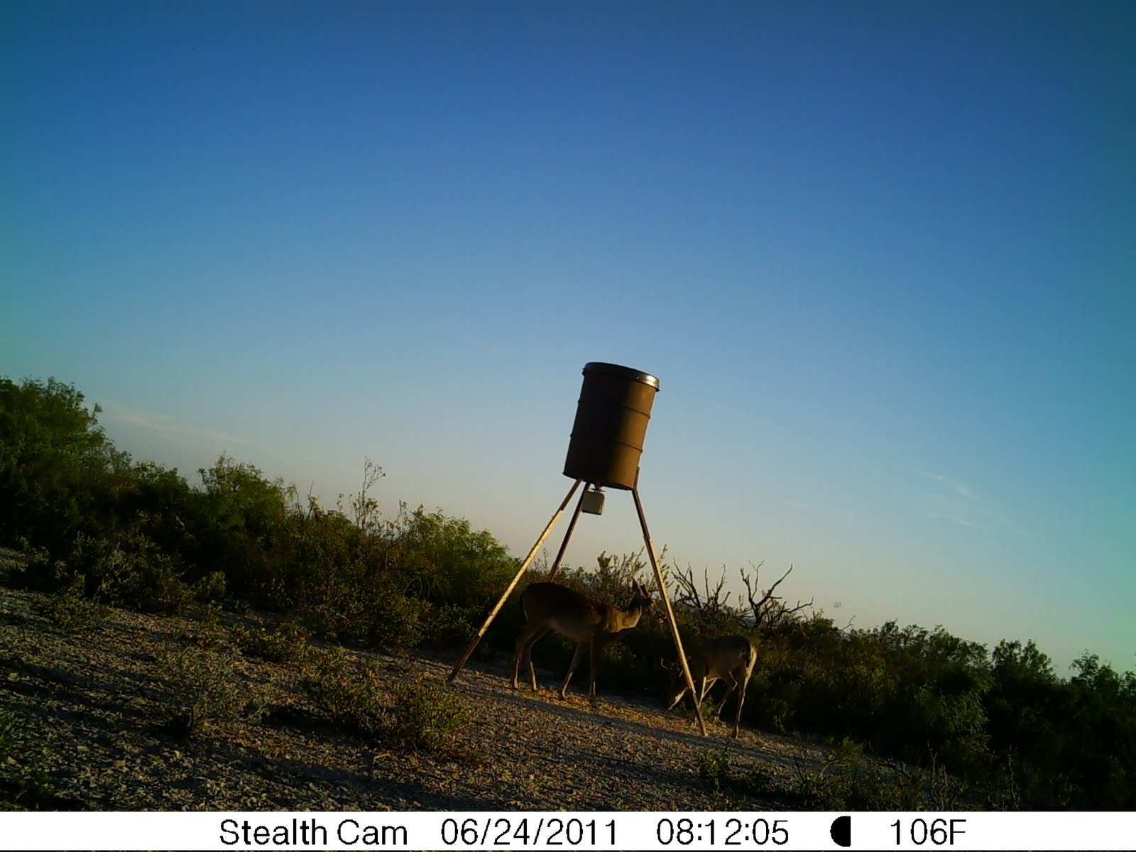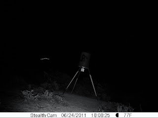 Witness report: I have a deer lease north west of Del Rio, Tx and have several trail cameras on the place to keep track of the wildlife. A couple weeks ago I was checking my pictures and came across this photo. I have included a couple of other photos so you can have some reference points. I went out there and stood behind the camera to see if there was a cell phone tower blinking in the distance or if there was a ridge where someone could be driving and there is nothing but open sky’s. I have never been a real big believer in UFO’s but I can not explain this no matter how hard I try. It seems to have the classic ” Triangular” shape that I have seen in other photo’s. We do have border patrol that survey the area for immigrants with helicopters, but again I have never seen one with that type of light pattern. Please respond back and let me know what you think.