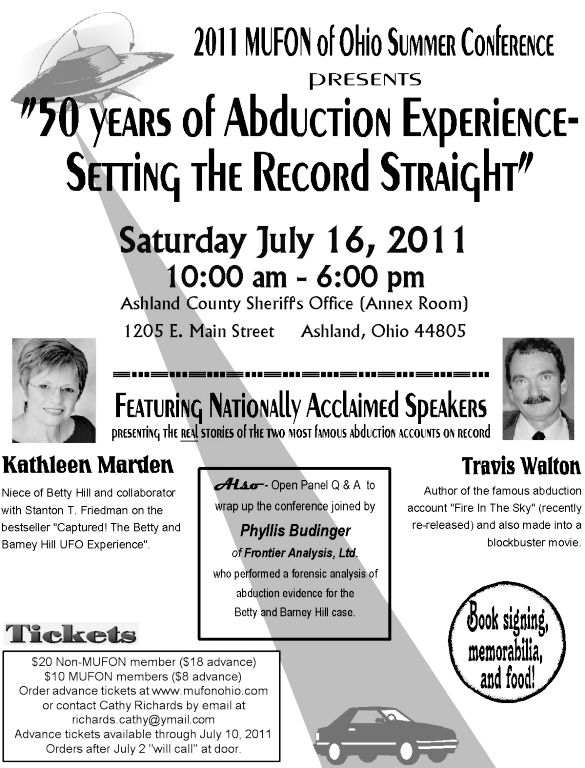 MUFON of Ohio summer conference May 17, 2011 LUFOS UFO News 0 2011 MUFON of Ohio Summer Conference presents 50 years of Abduction experience – Setting the record straight with Kathleen Marden and Travis Walton Click on the flyer to enlarge! Your opinion?Fake (0)Real (0)Not Alien (0) UFO and Aliens conferences