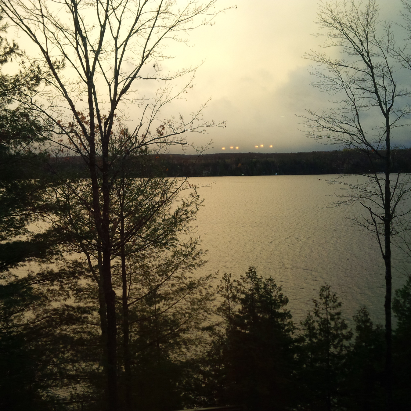 this picture was taken by my cellphone camera. late afternoon. the view is looking east south east from the back deck of our cottage.the setting sun is behind me and it was illuminating the sky and clouds which i thought was a nice picture.