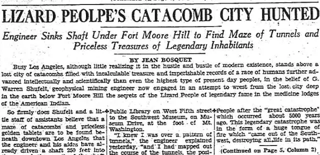 A mining engineer named G. Warren Shufelt allegedly met a wise old Hopi Indian man named “Little Chief Greenleaf” who told the story of an ancient city of the lizard people or “reptilians” as we know today. According to Little Chief, an ancient reptilian race who are highly intelligent and scientifically advanced than modern humans have taken refuge under hidden cities around the Pacific coast, one in Los Angeles and another in Mt. Shasta. Together with these ambiguous beings were mammoth quantities of treasures, gold and other valuable which lie hundreds of feet below. The busy and unsuspecting city did not know about this until Little Chief relates the story to Shufelt. That same year, Shufelt and his small crew made efforts to make a map of the underground tunnels using a “radio X-ray” and so the legend of the “lizard people” has begun.