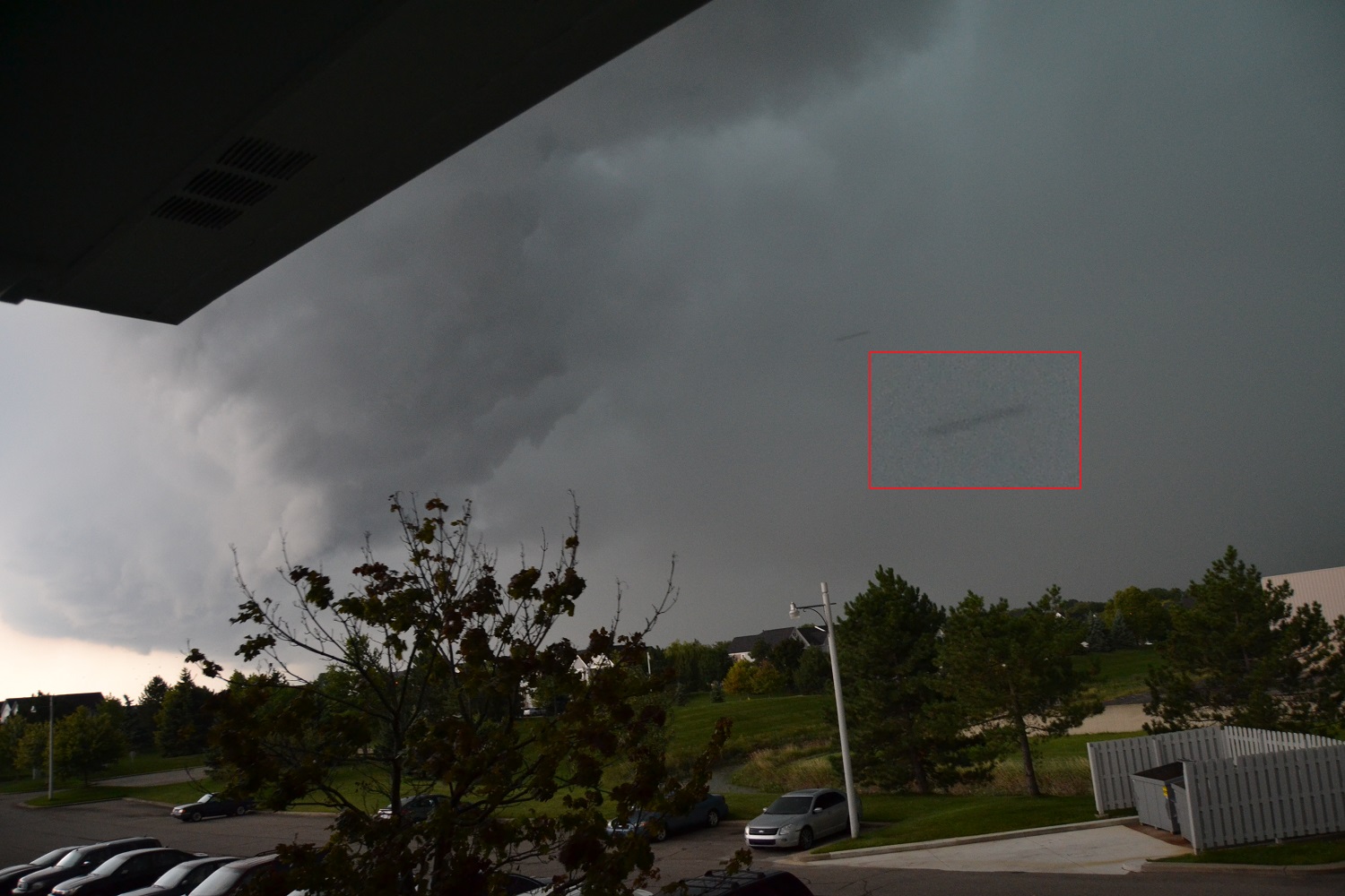 I am the person who took this photo. I give you my word and have the proof that this picture exists without being doctored up. Nothing has been added to this picture and this is exactly what my camera captured that stormy day in August, 2014. I have 2 other pictures that are not posted on this site that accompanied this picture. In a span of 1.2 seconds I took 4 continuous shots and 2 of the pictures had this object. It broke down to being 30/100s of a second in between each picture. The object you see here is the first captured when I took it in the south/southeast. The next 2 pics had absolutely no visible object, the last picture had this object, but it was approximately 150-300 feet southeast of the picture shown on this site. Sad that the 2nd picture of this object wasn't posted here.