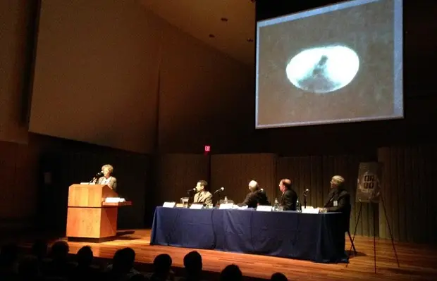 Researcher and author Thomas Carey revealed to a jam-packed crowd in Abramson Recital Hall that they have in possession an alien being lying in a glass case. However, he did not mean the actual alien, but a couple of Kodachrome color slides of it. Carey has been investigating the Roswell Incident since 1991.