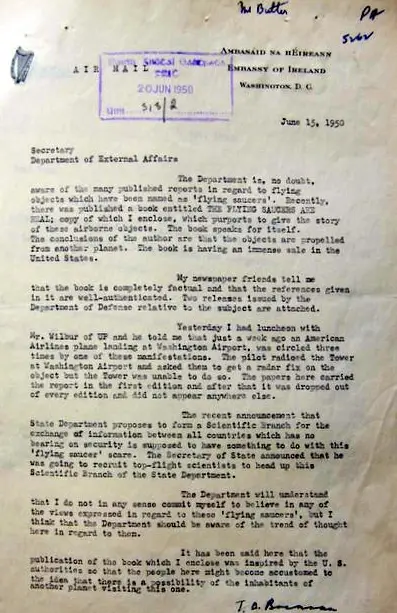 Irish government received a letter from the Irish Embassy in Washington in 1950. A staffer from the embassy sent a letter to the Department of External Affairs. Along with the letter was a book titled “The Flying Saucers Are Real,” by Donald Keyhoe.