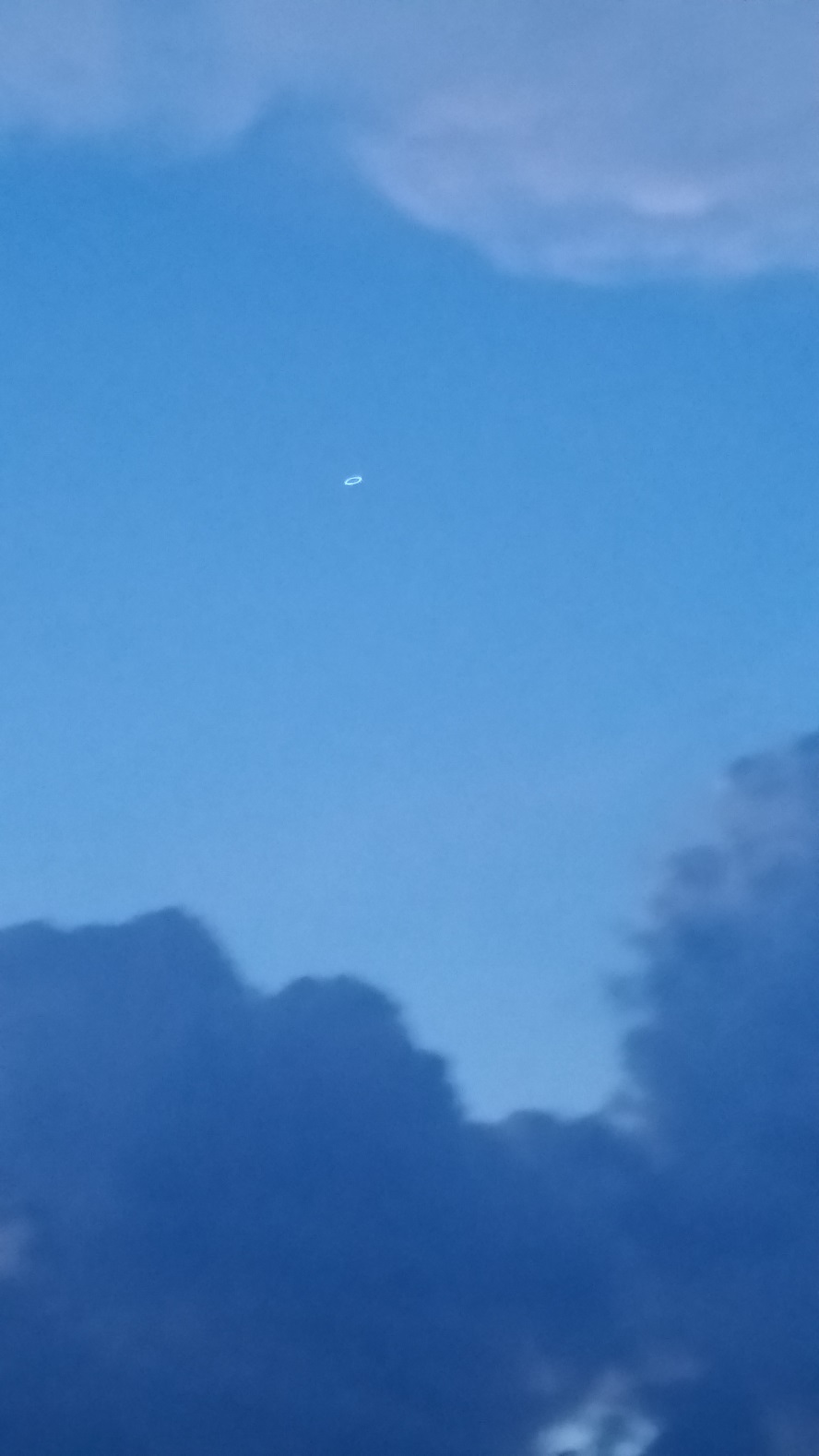 Witness report: I was photographing clouds with my cell phone. In between layers of cloud was what I thought a star until I went inside and zoomed in. The circle with a hole on the center was clearly not a star. I was in front of my house in New Ellenton, S. C. In Aiken County. I enjoy photographing the sky, stars moon and clouds. But I have never seen this before.