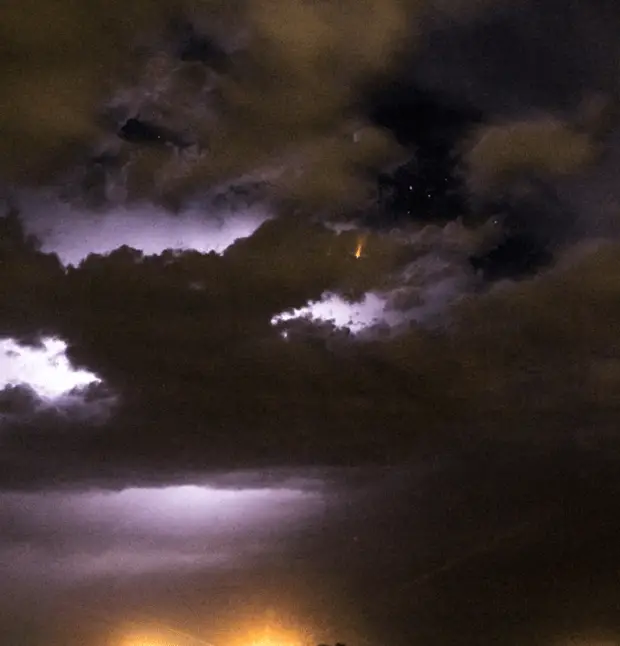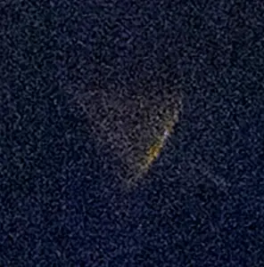 He saw a yellowish colored light with an odd shape that seemed to be shooting out of a cloud. When he zoomed in on the object, he noticed a triangle shape with a circle and marking that looked like a face on the bottom of it. He found it weird so he reported to Mutual UFO Network (MUFON). His testimony is filed in the witness reporting database, Case 71166.
