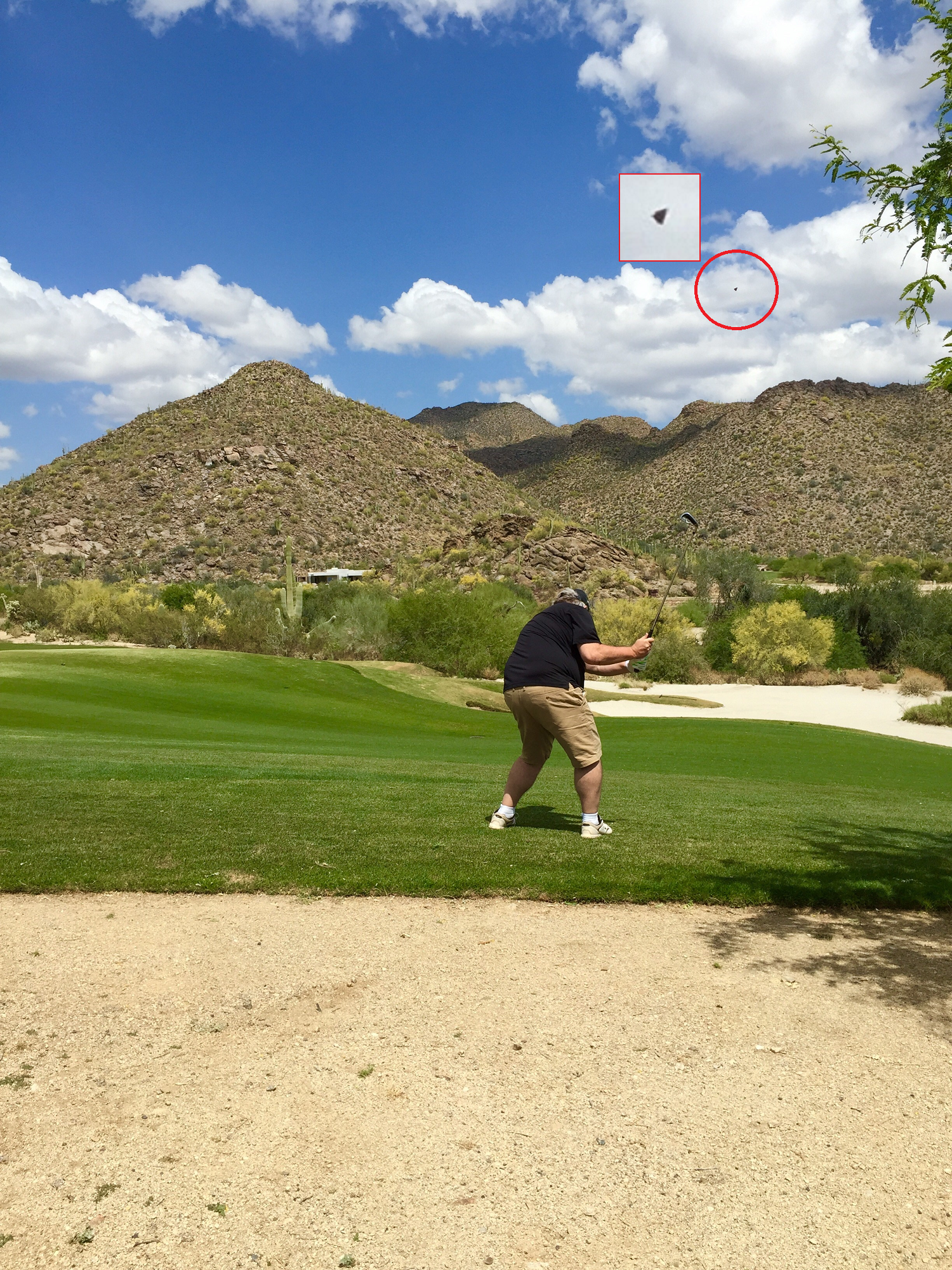 Witness report: On vacation playing golf, watched and heard F18’s flying around courses a lot, took picture of friend and saw craft in photo it made no sound unlike F18’s, it was so far off I didn’t think it was a craft, (maybe a bird) plus made no sound so I went back to playing golf. Later that evening was looking at image with friend and we decided it had to be a craft of some kind. I worked for General Dynamics for few years and watched a lot of military aircraft flying and this looked nothing like any I have observed. It appeared to be ascending in a straight line at about a 20 degree angle.