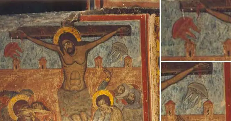 Conspiracy theorists claim to have seen an actual UFO floating close to the cross in a depiction of Christ’s crucifixion. A fresco painting in Georgia’s Svetitskhoveli Cathedral apparently shows a little hovering disc next to Jesus when he was crucified.