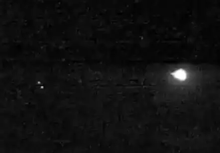 Witness report: Incredible video footage of a military jet chasing a UFO (yeah, that’s right, chasing one) right over our heads while out at the infamous Giant Rock in Landers while at this year’s Contact in the Desert (CITD) conference in Joshua Tree Calif. I, Melinda Leslie, was leading my Sunday night, May 21st, Sky Watch with Night Vision Goggle Intensive out at Giant Rock on the 3rd night of viewing events for CITD. Luckily one of my participants, Graham Slater, caught this and many of our other sightings (from all 3 nights no less), with his black and white night vision video camera. His additional footage of some of the other incrdible sightings will be posted at a future date once they are compiled. Here’s a description of the jet chase sighting: At just before 10:00 p.m. (did not note exact time) some of my participants and I saw a large amber colored light low to the horizon just behind Giant Rock from where my whole group of about 50 plus people were gathered and using 15 pair of night vision goggles. A contigenecy of about 20 of us ran to get a better view of it. To the naked eye it appeared to be a large orangish (amber) light, that quoting some of the 20 people; “flew like a bumble bee”. One guest, [name removed/CMS/jpg], came running with a pair of the goggles in hand and got a good look at it. She said that through the goggles it looked like “a large diamond shaped UFO.” She drew a picture of it attached here. This object then flew behind a small hill right behind the entire Sky Watch larger group. As those of us who ran off walked back to join the others, 3 military jets flew over in the direction of the object now gone from sight behind the hill. Some of us commented that “if” “they” were following it, meaning the jets, they were a few minutes too late. Just then we heard the sound of a low flying jet from behind the hill, and suddenly clearing the top of the hill and right over our heads, came a very fast military jet chasing a faster large red glowing light. The military jet had both red and white blinking strobe lights and glowing afterburners and was VERY loud as it flew directly above our heads. The large red light had NO blinking lights and NO sound at all! It became clear to all 50 plus witnesses, this was NO jet!!! Those folks present who looked with the aid of the goggles said they were seeing either 2 lights, or one object with 2 light sources on it. After extensive review of the footage, I am nearly certain it shows 2 UFOs (fast moving lights), flying in perfect locked tandem with one another. It appears you can see stars between them in the background suggesting that these are 2 seperate objects. As is usually the case, this footage while incredible, does not do the sighting justice. The video is in black and white night vision, not full-color naked-eye vision, and does not have any sound, so you are unable to hear the palatable excitement of 50 plus witnesses screaming and cheering.