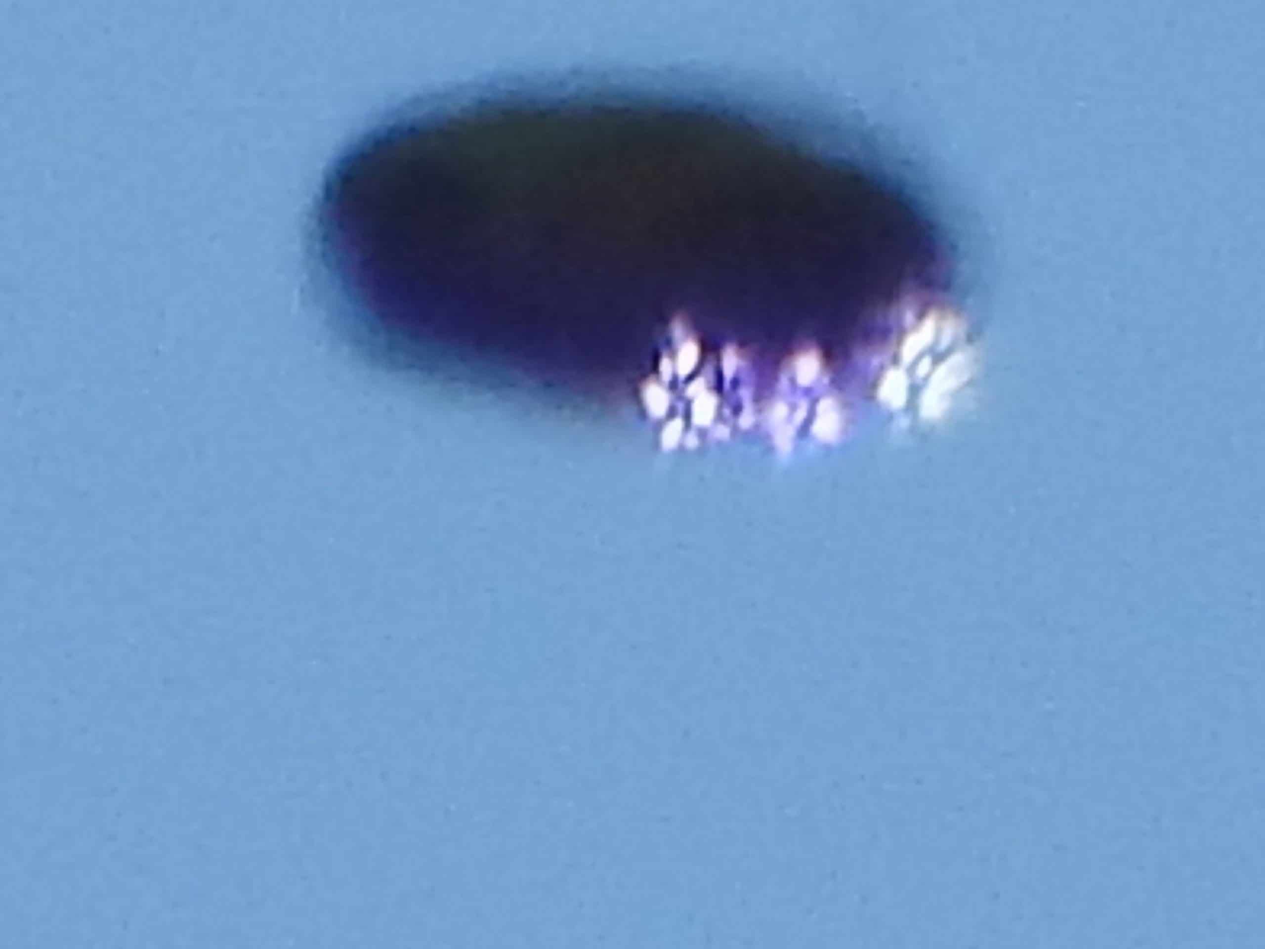 I had an incredible signing today. I was in the back garden sky watching and I had just zoomed in on a clear blue part of the sky with my Nikon P900 camera, when all of a sudden a saucer shaped craft flew directly into view. I was looking through the viewfinder at the time and I was very surprised by what I saw. I really wasn’t expecting to see any UFOs that close up. I was totally amazed. I could see that the surface of the saucer was very dirty looking like it was covered in soot, but what really caught my eye was the fact that I could see some sort of violet coloured energy being discharged from the back of the saucer shaped craft as it moved forwards through the air. I had never seen anything quite like it before. I could hardly believe what I was seeing… I quickly took a photograph of the saucer while moving the camera to follow the saucer as it flew across the sky. I was trying my best to hold the camera steady but it was almost impossible at such high magnification. The saucer then increased it’s speed and unfortunately I lost sight of it. I tried to reacquire the saucer in the viewfinder of the camera but it was no good it was gone. The saucer had been at a very high altitude and I definitely wouldn’t of seen it without my Nikon P900 camera. It was just sheer luck that I was already zoomed in to that part of the sky when the saucer had flown in to view. What on earth could this strange unidentified saucer craft be? The photograph was taken at 10:58 AM on the 11th of ‎March 2020 at Newton Abbot Devon England. All the best John.1. Saucer Discharging Energy Original