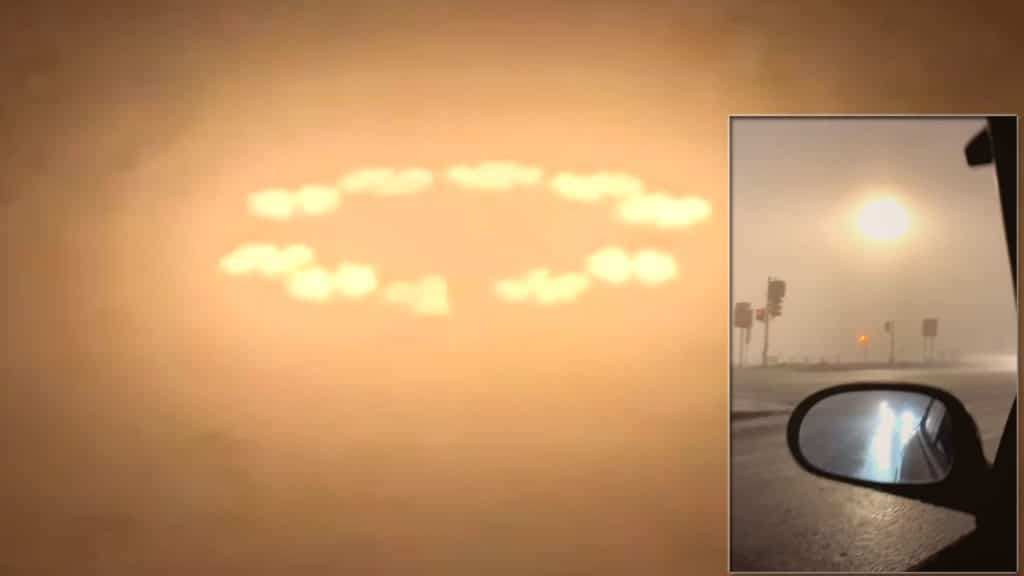 This is the effect you get when filming an LED street light in the darkness and fog… This is nothing more then a street light on Interstate 94 in Fargo ND where I live and everyone except the nutcase that made the vid agree that it’s fake…