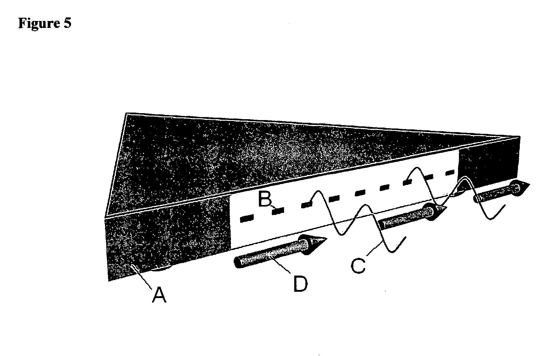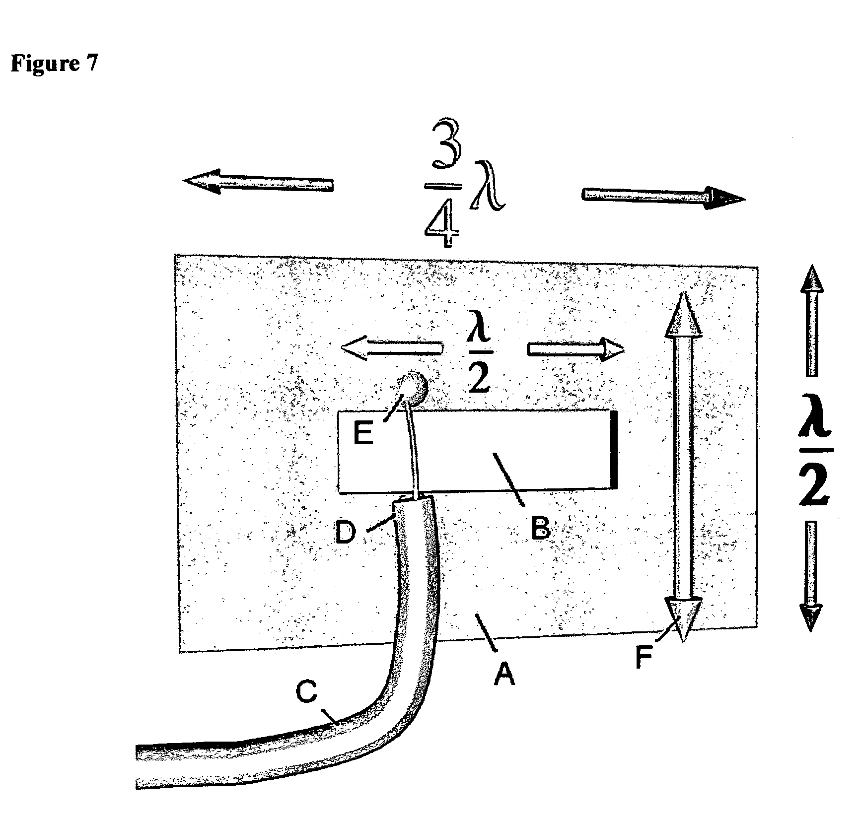(d) a horizontal slot antenna array mounted-on the sides of the hull; and (e) a frequency generator, antenna and coaxial cables to drive the antenna array (1d).