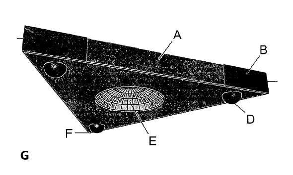 (b) two copper plates attached on opposite vertical sides at each of the three corners of the hull (1a) such that a sharp vertical edge is formed where they come together;