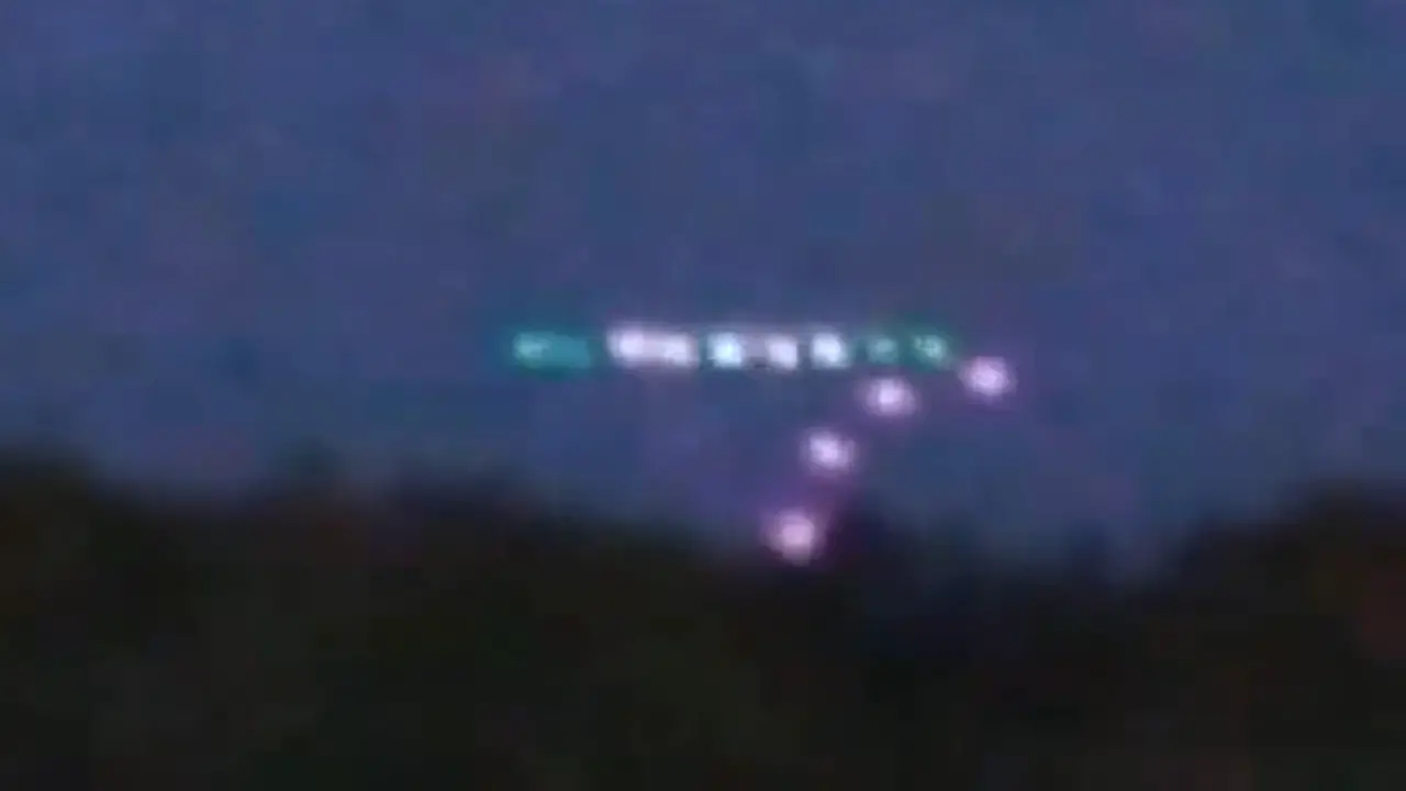 This family recorded these different colored lights from a distance all in a straight line hovering, after about 3 minutes, they drop in a very weird way in groups, sorted by color. It looks very weird and i suspect that these are not flairs for that reason, as they are hovering all together for 3 minutes, but then suddenly drop. This happened over Russia on 1st June 2020.