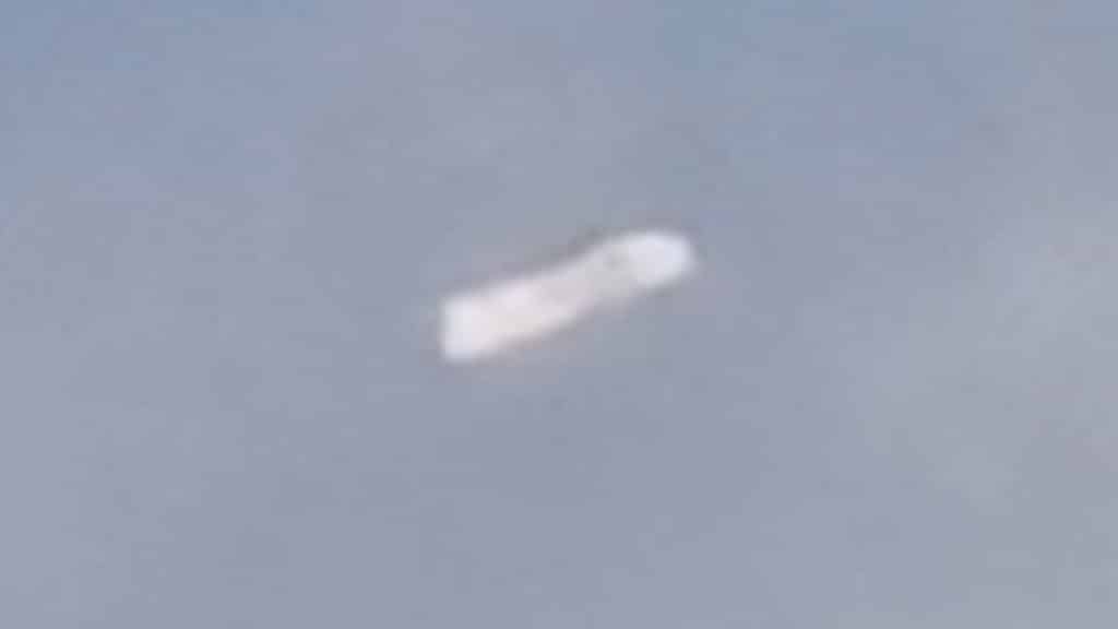 It might be the sun reflection off an aluminum fuselage. The wings are at different angle so are dark. Is even dimmer in center where the wings would be attached. It is all somewhat obscured by light clouds under the craft.