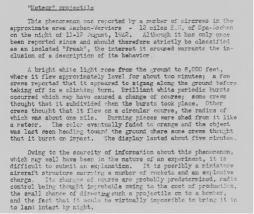 The strange objects flying over northern Italy at that time remain unexplained. In February 1944, another group of bomber crews spotted two cigar-shaped objects near Koblenz and an over Aachen. These objects were referred to in reports submitted by Bomber Command.