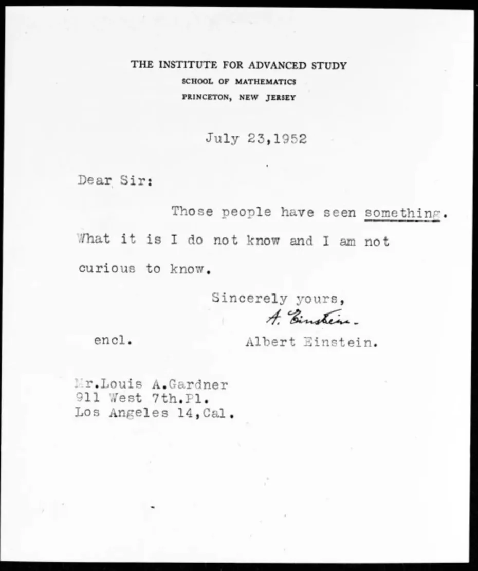 This response may seem surprising coming from a man who once said, “The important thing is not to stop questioning. Curiosity has its own reason for existing” and who had also told his biographer just months prior that he was “passionately curious.” However, it is important to remember that Einstein was a scientist, and as such, he likely would have required concrete evidence and scientific explanation before becoming curious about a phenomenon. The lack of concrete information and the Air Force’s hasty attempts to explain the sightings away may have been enough for Einstein to remain skeptical and uninvested in the situation.