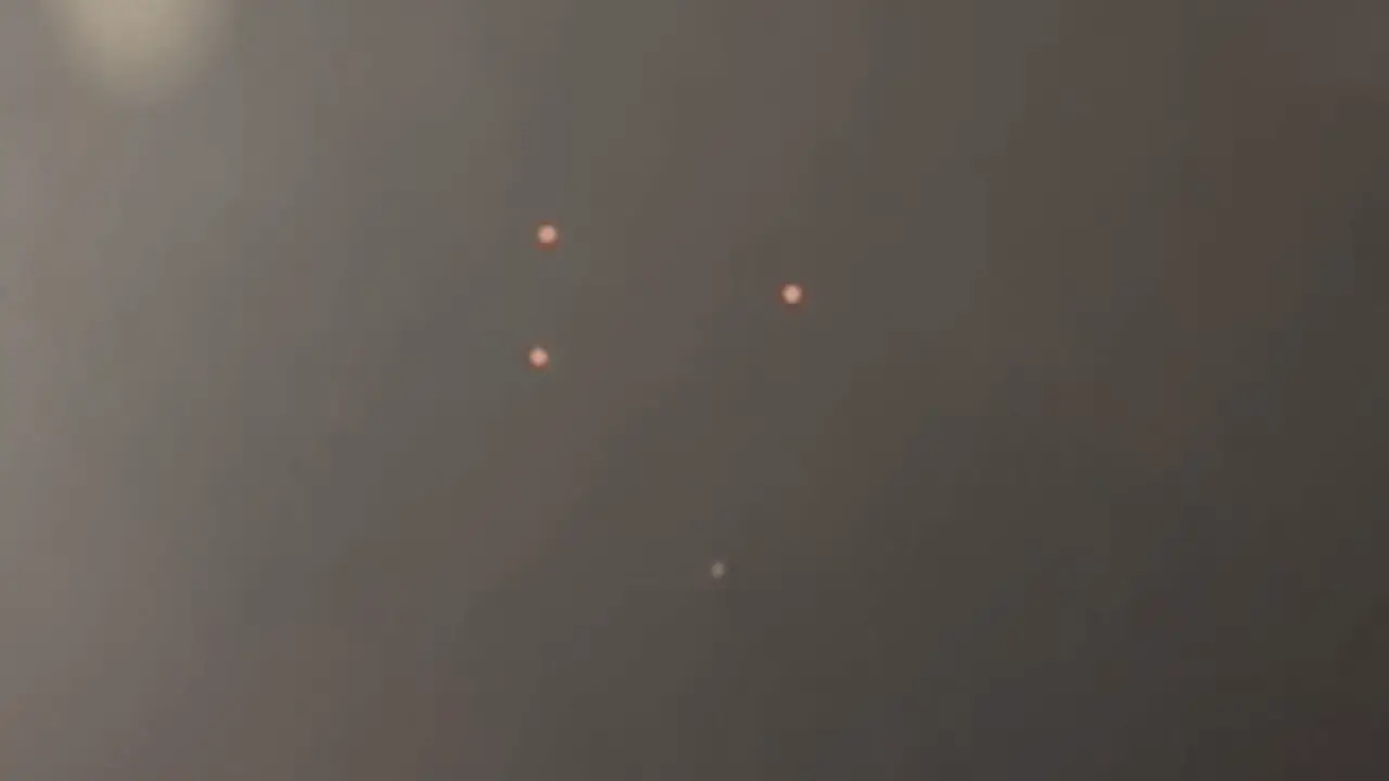 The witness was able to capture a photo from the back seat of the car, which confirms the presence of five lights. He also attempted to record a video using his iPhone, but due to the glare from streetlights and the dirty windshield, it was difficult to make out any details. However, the video does show a decrease in the number of lights, from four at the beginning to three in a perfect triangle formation.