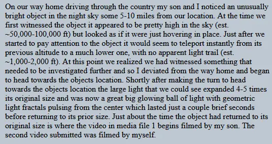 As they got closer, the large light that they had seen expanded 4-5 times its original size, becoming a glowing ball of light with geometric light fractals pulsing from the center. This lasted for just a couple of brief seconds before returning to its original size. It was at this point that the son began filming the UFO, the video of which can be seen in media file 1. The second video, filmed by the father, is also included in this post.