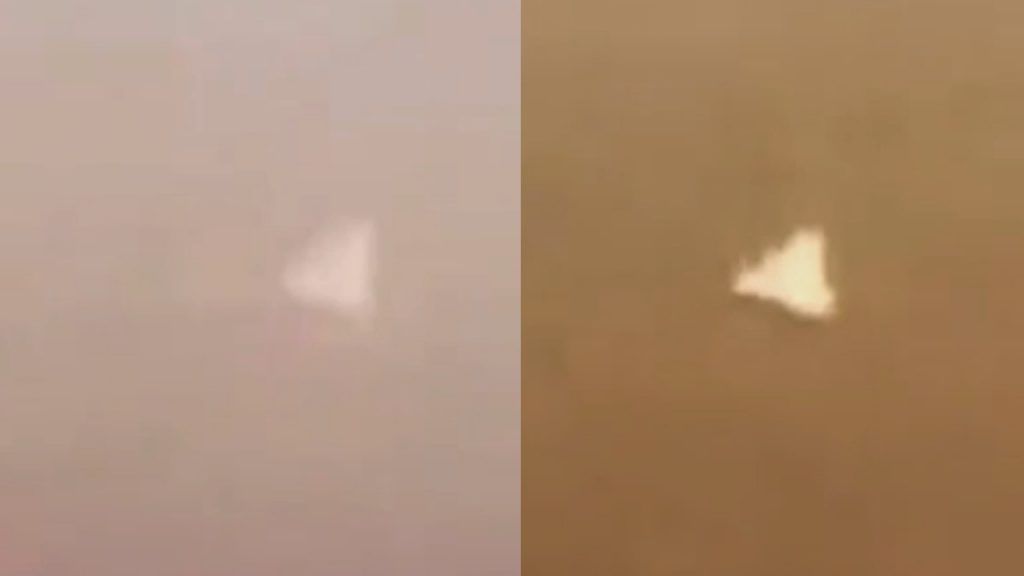 The first witness footage shows a glowing triangular object hovering in the sky, with what appears to be a faint white light emanating from its tip. The second video was captured from a moving vehicle, and shows the same triangular object hovering in the distance, seemingly stationary as the camera shakes slightly from the car’s motion. In the background, the witness can be heard exclaiming in Ukrainian, “It’s not in the clouds, it’s over there!” as she points towards the object.